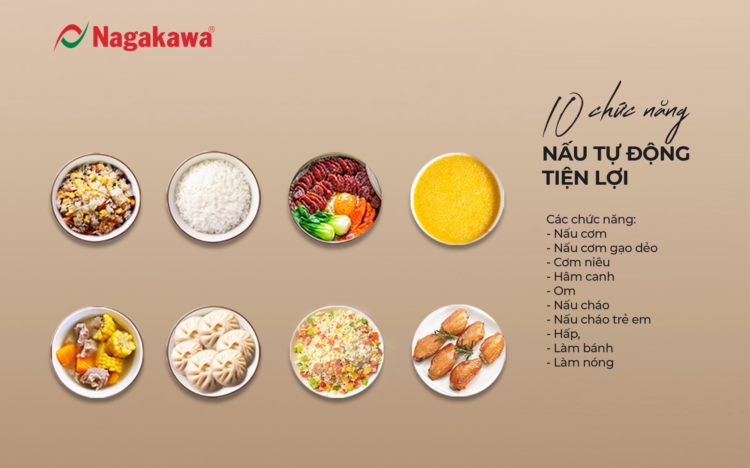Nồi cơm điện tử lòng niêu Nagakawa NAG0142 được thiết kế sẵn 10 chương trình nấu tiện lợi. Bao gồm: nấu cơm, nấu cơm gạo dẻo, cơm niêu, hâm canh, om, nấu cháo, nấu cháo trẻ em, hấp, làm bánh, làm nóng.