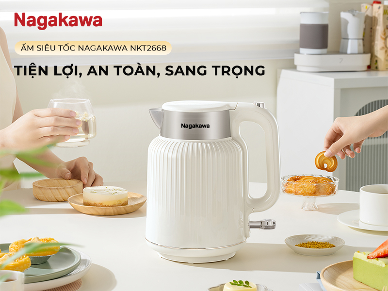 Ấm siêu tốc Nagakawa NKT2668 với dung tích 1.7 lít là giải pháp lý tưởng cho nhu cầu nước nóng của cả gia đình bạn. Sở hữu thiết kế sang trọng, hiện đại cùng những tính năng an toàn vượt trội, NKT2668 không chỉ mang đến sự tiện nghi tối đa mà còn góp phần tô điểm cho không gian bếp thêm phần tinh tế.