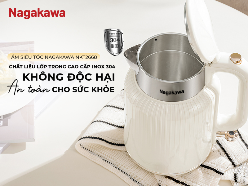 Thấu hiểu sự quan tâm của người tiêu dùng đến sức khỏe, Nagakawa đã lựa chọn chất liệu inox 304 cao cấp cho ruột ấm NKT2668. Inox 304 nổi tiếng với độ bền cao, khả năng chống gỉ sét tuyệt vời và đặc biệt an toàn cho sức khỏe, không sản sinh ra chất độc hại trong quá trình đun nấu. Nhờ đó, bạn có thể hoàn toàn yên tâm sử dụng NKT2668 để đun nước uống, pha trà, nấu mì,... mà không lo ảnh hưởng đến sức khỏe của cả gia đình.